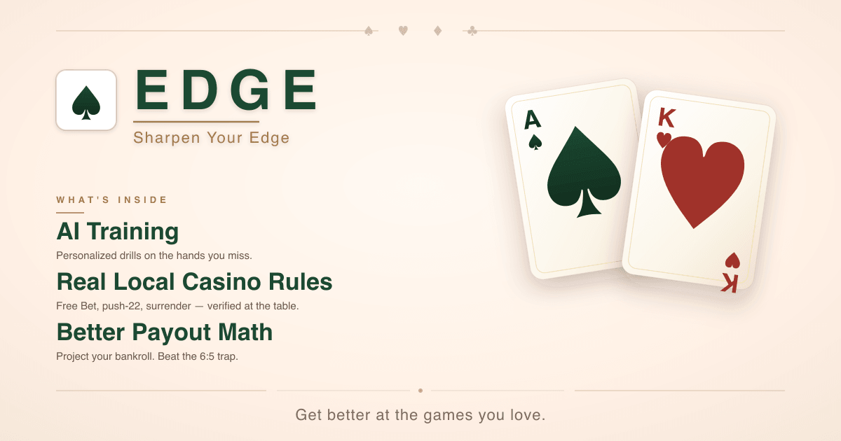 Get better at the games you love. Train against your casino's exact rules — 6:5 payouts, Free Bet, push-22 — and walk in with the small advantages that turn the house's percentages into your own.